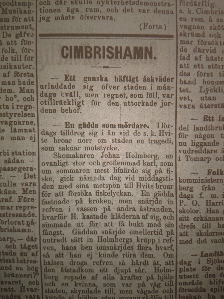 -En gädda som mördare. I lördags tilldrog sig i ån vid de s.k. Hvite broar norr om staden en tragedi, som saknar motstycke.